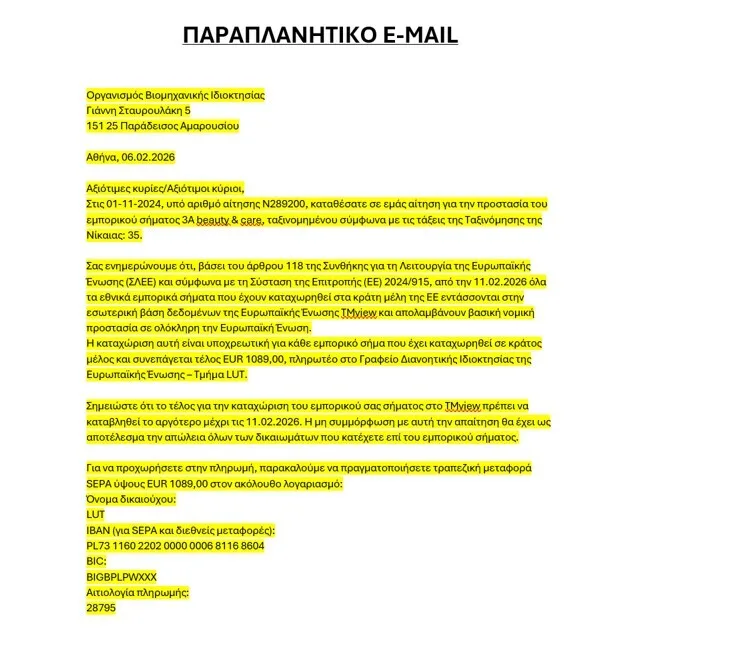 Ο Οργανισμός Βιομηχανικής Ιδιοκτησίας (ΟΒΙ) ενημερώνει το κοινό ότι κατά το τελευταίο εικοσιτετράωρο έχουν εντοπιστεί περιστατικά ηλεκτρονικής απάτης, τα οποία αφορούν στην αποστολή παραπλανητικών ηλεκτρονικών μηνυμάτων στους καταθέτες /δικαιούχους εμπορικών σημάτων, με αιτήματα καταβολής τελών που φέρονται να σχετίζονται με υπηρεσίες του Οργανισμού.