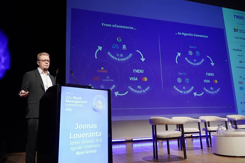 Τις ευρωπαϊκές τάσεις που διαμορφώνουν το νέο εμπορικό και τραπεζικό περιβάλλον ανέδειξαν στη συνέχεια δύο κορυφαία στελέχη του Ομίλου Nexi. Ο Joonas Loueranta, Senior Director AI & Agentic Commerce της Nexi, παρουσίασε τη ραγδαία μετάβαση προς το agentic commerce – ένα νέο μοντέλο όπου οι AI agents επηρεάζουν όχι μόνο τον τρόπο αναζήτησης προϊόντων, αλλά και τη ροή των συναλλαγών, εισάγοντας έναν νέο «ενδιάμεσο» στο οικοσύστημα πληρωμών. Τόνισε πώς οι πρόσφατες εξελίξεις από OpenAI, Google και τα διεθνή σχήματα καρτών διαμορφώνουν νέα πρότυπα πληρωμών, ενώ ταυτόχρονα δημιουργούν σημαντικές ανάγκες προσαρμογής για την ευρωπαϊκή αγορά και το κανονιστικό πλαίσιο. Όπως ανέφερε, «το agentic commerce εξελίσσεται πολύ γρηγορότερα από τα σημερινά ρυθμιστικά και τεχνολογικά πλαίσια. Η πραγματική πρόκληση δεν είναι η αυτοματοποίηση, αλλά το πώς ευθυγραμμίζεται ολόκληρο το οικοσύστημα ώστε αυτές οι νέες αρχιτεκτονικές συναλλαγών να λειτουργούν με ασφάλεια και διαφάνεια».