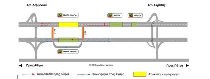 Αποκλεισμός του κλάδου προς Πάτρα και εκτροπή της κυκλοφορίας στην παράπλευρη βοηθητική οδό των σηράγγων, όπως φαίνεται στο ακόλουθο σχηματικό διάγραμμα. Η κυκλοφορία προς Αθήνα δεν επηρεάζεται.
