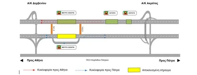 Αποκλεισμός του κλάδου προς Αθήνα και εκτροπή της κυκλοφορίας στον κλάδο κυκλοφορίας προς Πάτρα μέσω των Ανοιγμάτων Έκτακτης Ανάγκης (Α.Ε.Α.) από τη Χ.Θ. 143,30 έως τη Χ.Θ. 141,30. Αποκλεισμός του κλάδου προς Πάτρα και εκτροπή της κυκλοφορίας στην παράπλευρη βοηθητική οδό των σηράγγων, όπως φαίνεται στο ακόλουθο σχηματικό διάγραμμα: