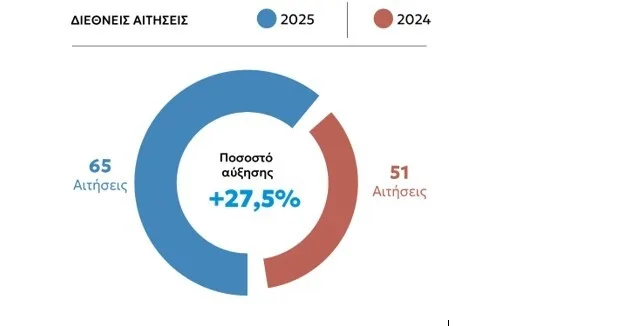 Κατατέθηκαν συνολικά 65 διεθνείς αιτήσεις με τουλάχιστον έναν Έλληνα δικαιούχο, έναντι 51 καταθέσεων, με τουλάχιστον έναν Έλληνα δικαιούχο, που παρελήφθησαν το 2024.