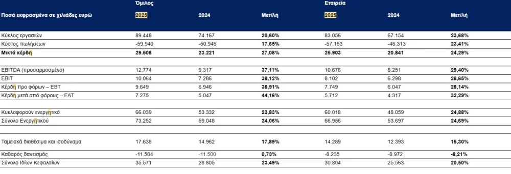 Οι σημαντικότερες μεταβολές αποτελεσμάτων του Ομίλου για το 2025, σε σύγκριση με τα αντίστοιχα του 2024, συνοψίζονται στα εξής: