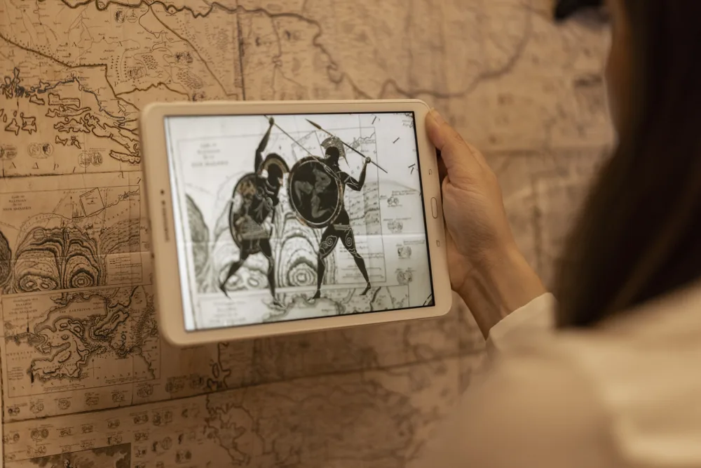 Και «επαυξημένο ψηφιακό ξεναγό» που ζωντανεύει τα αντικείμενα με τη χρήση τάμπλετ, προσφέροντας πληροφορίες που διαφορετικά δεν θα είχαμε σε μια επίσκεψη μας στη Βιβλιοθήκη από κοντά.