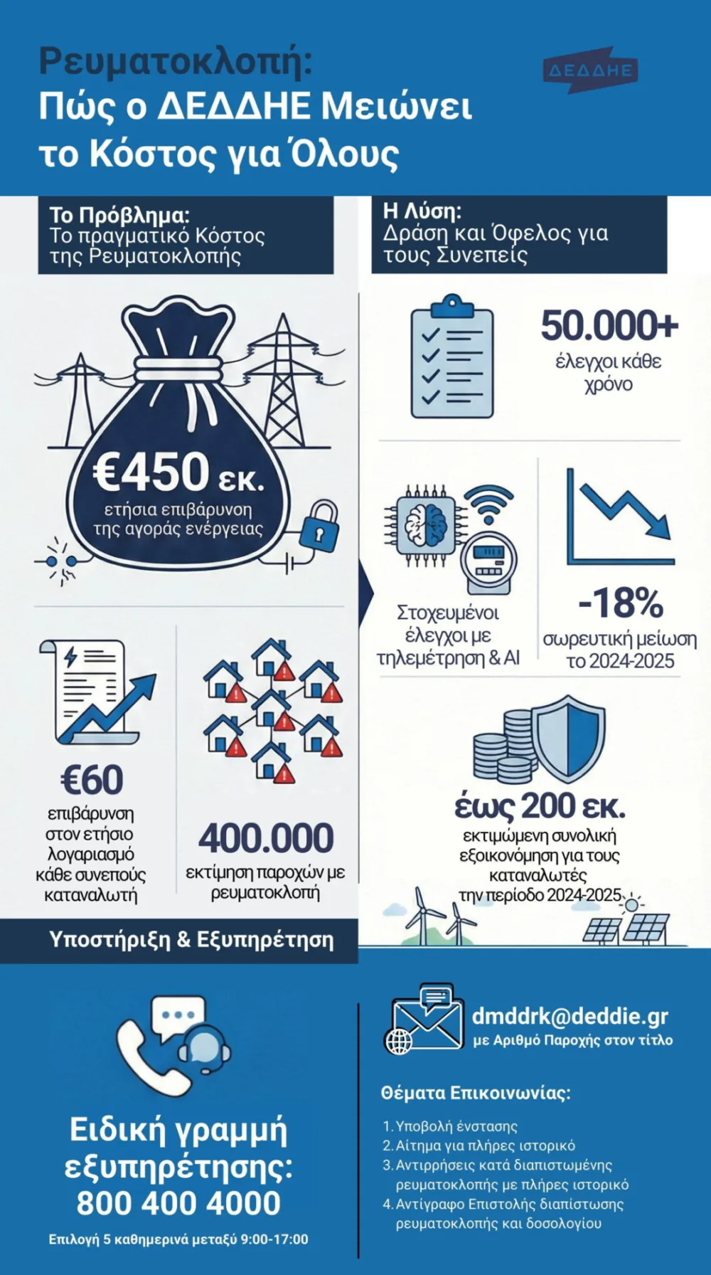Με στοχευμένες ενέργειες και αναβαθμισμένους μηχανισμούς υποστήριξης, ο ΔΕΔΔΗΕ, ως αξιόπιστος και υπεύθυνος Διαχειριστής, αντιμετωπίζει ένα σημαντικό φαινόμενο με κοινωνικό κόστος, προστατεύει τους συνεπείς καταναλωτές και διασφαλίζει δίκαιους και ίσους όρους για όλους στην αγορά ενέργειας.