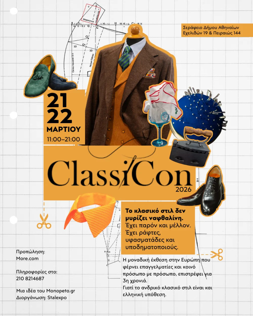Το ClassiCon, η ελληνική διοργάνωση αφιερωμένη στο κλασικό ανδρικό στιλ, επιστρέφει για τρίτη χρονιά στο Σεράφειο του Δήμου Αθηναίων στις 21 και 22 Μαρτίου 2026, συγκεντρώνοντας τεχνίτες, ατελιέ και δημιουργούς που υπηρετούν την τέχνη του χειροποίητου κοστουμιού, του πουκαμίσου, των υποδημάτων και των αξεσουάρ.