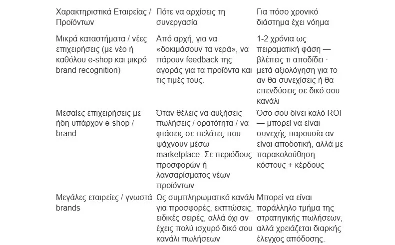 - 1-2 χρόνια: Αν μετά από αυτό το διάστημα έχεις σταθερό όγκο πωλήσεων, καλό ROI, ικανοποιημένο πελατολόγιο, τότε μπορείς να κάνεις το marketplace ένα σταθερό κομμάτι της στρατηγικής σου.