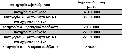 Οι νέοι πόροι κατευθύνονται στις επιδοτήσεις οχημάτων νομικών προσώπων (κατηγορία Β) και ποδηλάτων φυσικών προσώπων (Κατηγορία Α). Η νέα κατανομή του προϋπολογισμού έχει ως εξής:'