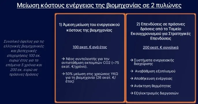 Η συνολική ελάφρυνση στο κόστος ενέργειας εκτιμάται ότι θα φτάσει τα 300 εκατ. ευρώ και βασίζεται σε δύο βασικούς άξονες: ο πρώτος προβλέπει την άμεση μείωση της τιμής της ηλεκτρικής ενέργειας, ενώ ο δεύτερος περιλαμβάνει κίνητρα για την ενίσχυση των επιχειρήσεων με στόχο την ενεργειακή αναβάθμιση τόσο του εξοπλισμού όσο και των κτιριακών τους εγκαταστάσεων.