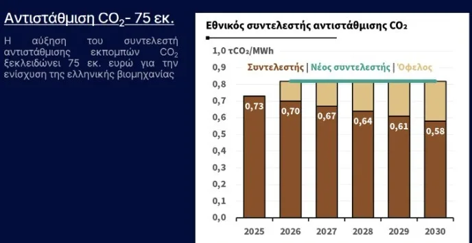 Βασικό εργαλείο του πρώτου άξονα είναι η αύξηση του συντελεστή αντιστάθμισης εκπομπών CO2 για την περίοδο 2026-2030, που μεταφράζεται σε ενίσχυση της τάξης των 75 εκατ. ευρώ τον χρόνο για τις ενεργοβόρες βιομηχανίες.