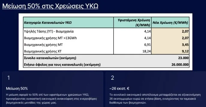 Από την 1η Ιουλίου επίσης μειώνονται κατά 50% οι χρεώσεις για τις Υπηρεσίες Κοινής Ωφέλειας (ΥΚΩ) που πληρώνουν 23.000 βιομηχανίες, οι οποίες ηλεκτροδοτούνται από τη μέση και υψηλή τάση. Το κόστος των μέτρων είναι στα 26 εκατ. ευρώ.
