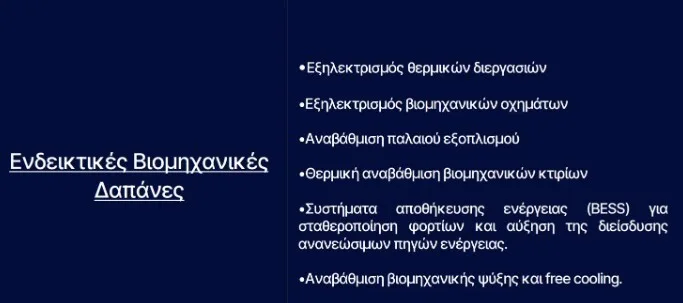 Οι παρεμβάσεις που θα χρηματοδοτηθούν καλύπτουν κρίσιμες τεχνολογίες ενεργειακής αναβάθμισης, όπως εξηλεκτρισμός θερμικών διεργασιών, αναβάθμιση εξοπλισμού και υποδομών, συστήματα αποθήκευσης ενέργειας (BESS), ανάκτηση θερμότητας και ενεργειακή αναβάθμιση κτιρίων και ψύξης.