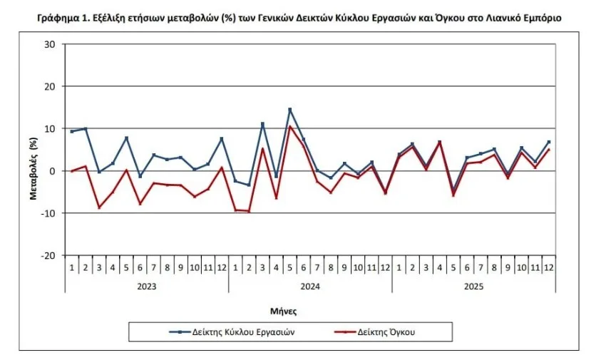 Ο Γενικός Δείκτης Όγκου (κύκλος εργασιών σε σταθερές τιμές), κατά τον μήνα Δεκέμβριο 2025, ενισχύθηκε κατά 5,1% σε σύγκριση με τον αντίστοιχο δείκτη του Δεκεμβρίου 2024, και κατά 10,4% συγκριτικά με τον Νοέμβριο του 2025.