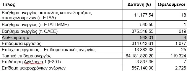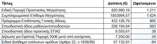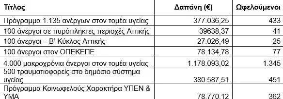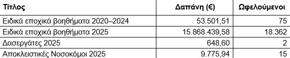 Παρουσιάζονται αναλυτικά οι συνολικές δαπάνες και ο αριθμός ωφελουμένων, οργανωμένες σε τέσσερις βασικές κατηγορίες.
