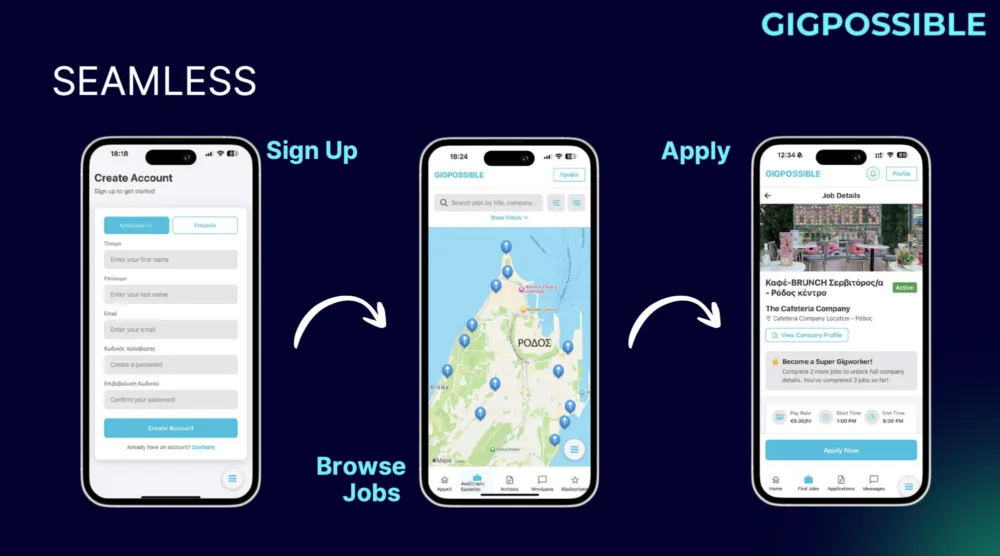 Για τους εργαζόμενους, η εμπειρία είναι εξίσου σημαντική. Μπορούν να επιλέγουν πρωινές, απογευματινές ή βραδινές βάρδιες, να αναζητούν σταθερή ή ευέλικτη απασχόληση, να χτίζουν επαγγελματικό προφίλ με reviews και να έχουν πρόσβαση σε ευκαιρίες τόσο σε τουριστικούς κόμβους, όπως η Ρόδος, όσο και σε μεγάλα αστικά κέντρα, όπως η Αθήνα.