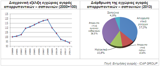 Η εγχώρια αγορά απορρυπαντικών και σαπουνιών παρουσίασε ανοδική τάση το χρονικό διάστημα 1990-2008, με μέσο ετήσιο ρυθμό αύξησης 2,5%. Την τελευταία πενταετία ωστόσο το συνολικό μέγεθος αγοράς μειώθηκε, με μέσο ετήσιο ρυθμό 4% περίπου. Η εισαγωγική διείσδυση ανήλθε σε 36,4% το 2013, ενώ οι εξαγωγές κάλυψαν το 36% της εγχώριας παραγωγής».