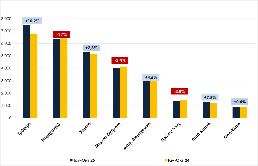 Σε κλαδικό επίπεδο, ο κλάδος των τροφίμων κατέγραψε τη μεγαλύτερη αύξηση σε απόλυτες τιμές, σημειώνοντας άνοδο €688,6 εκατ. ή 10,2%, επιβεβαιώνοντας τη συνεχιζόμενη δυναμική του στις διεθνείς αγορές. Αξιοσημείωτη αύξηση παρουσίασαν επίσης τα διάφορα βιομηχανικά είδη, με ενίσχυση €137,0 εκατ. (4,6%), καθώς και ο κλάδος των χημικών προϊόντων, που σημείωσε άνοδο €120,8 εκατ. ή 2,3%.