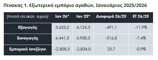 Στα 3,6 δισ. ευρώ οι εξαγωγές τον Ιανουάριο του 2026 – Ελαφριά μείωση παρουσίασε το εμπορικό έλλειμμα