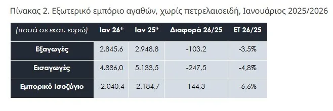 Η εικόνα των εμπορευματικών συναλλαγών άνευ πετρελαιοειδών εμφανίζει σημαντικές διαφορές με τις εξαγωγές να ανέρχονται σε 2.948,6 εκατ. ευρώ τον Ιανουάριο του 2026 έναντι 2.948,8 εκατ. ευρώ τον Ιανουάριο του 2025 μειωμένες κατά 103,2 εκατ. ευρώ, δηλαδή 3,5% και τις εισαγωγές να ανέρχονται σε 4.886,0 εκατ. ευρώ, μειωμένες και αυτές κατά 247,5 εκατ. ευρώ, δηλαδή 4,8%. Το εμπορικό έλλειμμα μειώθηκε κατά 144,3 εκατ. ευρώ, δηλαδή 6,6% και ανήλθε σε 2.040,4 εκατ. ευρώ