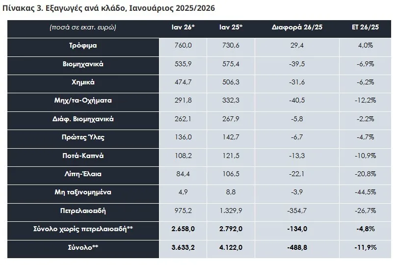 Αναλύοντας τις εξαγωγικές επιδόσεις ανά κλάδο, αύξηση καταγράφηκε μόνο στον κλάδο των τροφίμων, κατά 29,4 εκατ. ευρώ ή 4,0% σε σύγκριση με την αντίστοιχη περσινή περίοδο. Αντίθετα, οι περισσότεροι κλάδοι παρουσίασαν μείωση. Συγκεκριμένα, τα βιομηχανικά προϊόντα μειώθηκαν κατά 39,5 εκατ. ευρώ ή -6,9%, τα χημικά κατά 31,6 εκατ. ευρώ ή -6,2%, ενώ σημαντική υποχώρηση σημείωσε ο κλάδος των μηχανημάτων–οχημάτων κατά 40,5 εκατ. ευρώ ή -12,2%. Μείωση κατέγραψαν επίσης τα διάφορα βιομηχανικά προϊόντα κατά 5,8 εκατ. ευρώ ή -2,2%, οι πρώτες ύλες κατά 6,7 εκατ. ευρώ ή -4,7%, καθώς και ο κλάδος των ποτών και καπνών κατά 13,3 εκατ. ευρώ ή -10,9%. Παράλληλα, οι εξαγωγές λιπών και ελαίων υποχώρησαν κατά 22,1 εκατ. ευρώ ή -20,8%. Τέλος, ο κλάδος των πετρελαιοειδών κατέγραψε τη μεγαλύτερη πτώση, της τάξεως των 354,7 εκατ. ευρώ ή -26,7%, διαμορφούμενος σε 975,2 εκατ. ευρώ από 1.329,9 εκατ. ευρώ τον Ιανουάριο του 2025.