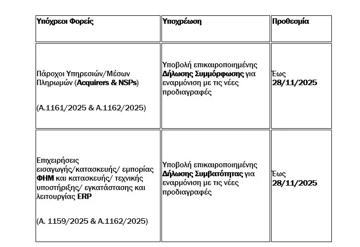 Περαιτέρω, καθορίζονται οι προθεσμίες συμμόρφωσης για τις εταιρείες τεχνολογίας και πληρωμών, ως εξής: