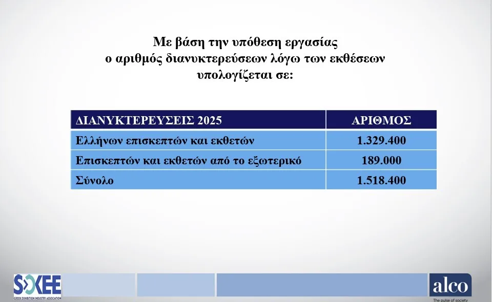Με 1,5 εκατ. διανυκτερεύσεις και εκατοντάδες εκατομμύρια έσοδα, οι εκθέσεις δίνουν έξτρα πνοή στο τουριστικό μοντέλο: Νέα έρευνα αποκαλύπτει τη μεγάλη οικονομική και τουριστική συμβολή του εκθεσιακού κλάδου, με εκατοντάδες εκατομμύρια ευρώ σε δαπάνες και ισχυρό αποτύπωμα στην εξωστρέφεια της ελληνικής οικονομίας