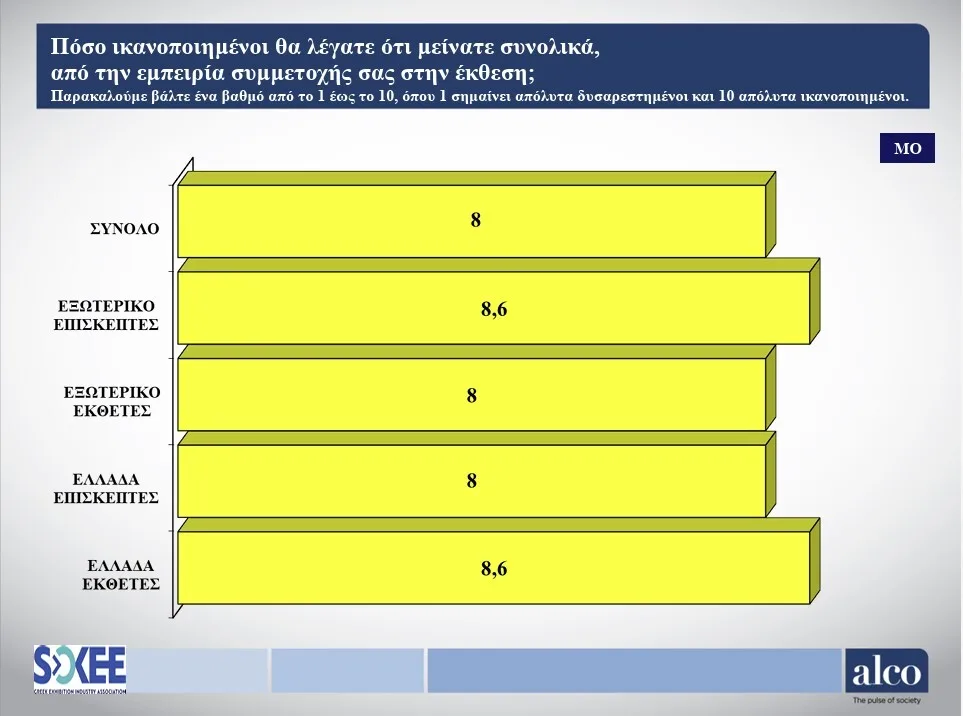 Ένα ακόμη στοιχείο που έχει ιδιαίτερη σημασία είναι το επίπεδο ικανοποίησης των συμμετεχόντων. Η μέση βαθμολογία φτάνει το 8/10, ενώ στους ξένους επισκέπτες αγγίζει το 8,6/10, γεγονός που αποτυπώνει την ποιότητα των διοργανώσεων αλλά και τη συνολική εμπειρία στη χώρα. Παράλληλα, το 88% των συμμετεχόντων δηλώνει ότι η ίδια η Ελλάδα αποτελεί βασικό κίνητρο συμμετοχής, επιβεβαιώνοντας ότι το εθνικό brand λειτουργεί συμπληρωματικά προς τον εκθεσιακό κλάδο.