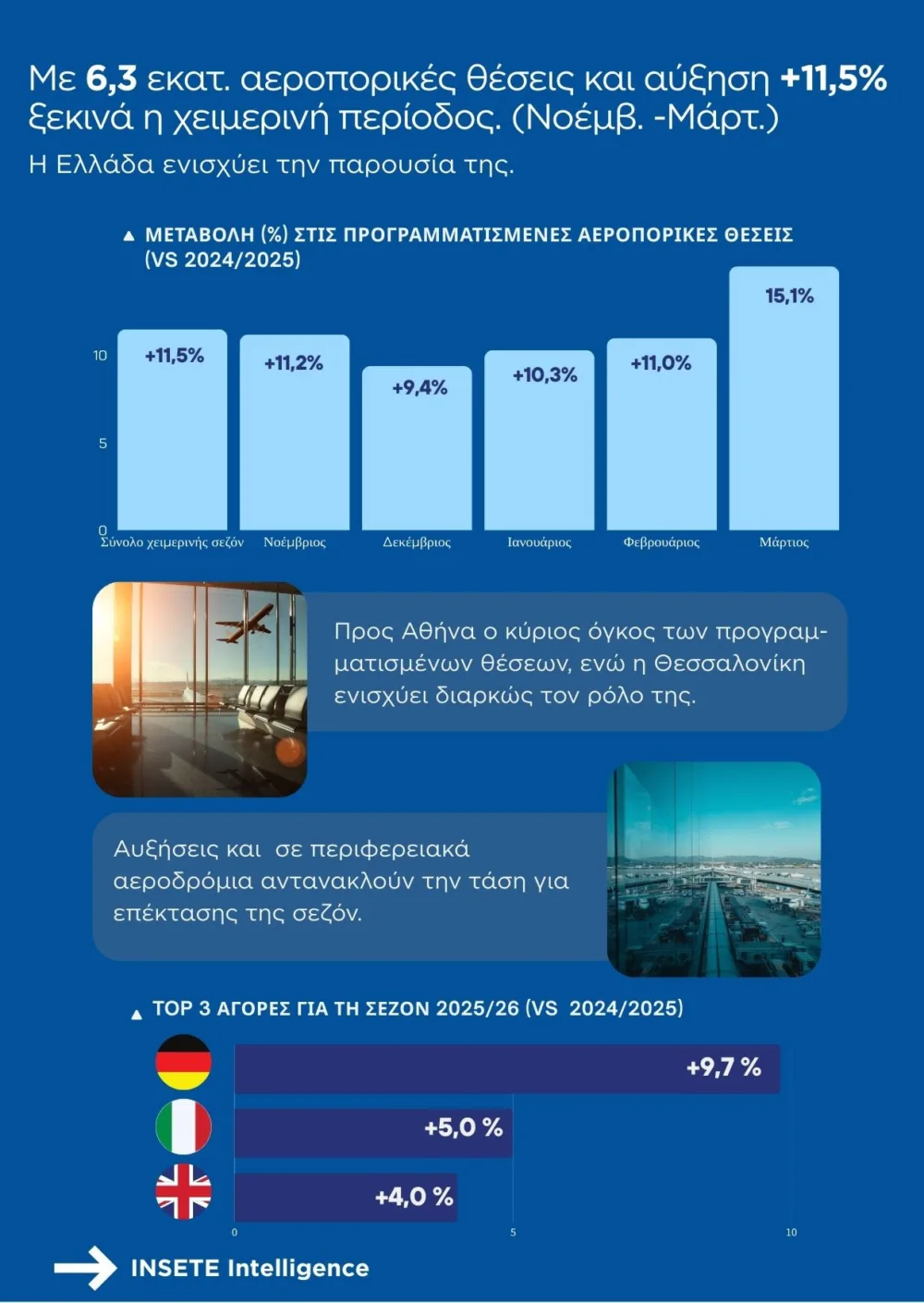 Για τη χειμερινή περίοδο Νοέμβριος – Μάρτιος, έχουν προγραμματιστεί 6,3 εκατομμύρια αεροπορικές θέσεις, καταγράφοντας αύξηση +649.834 / +11,5% σε σχέση με το 2024/25.