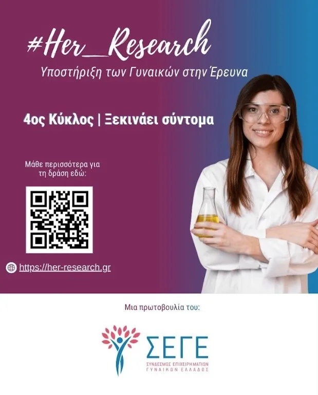 Το #Her_Research, επιστρέφει με τον 4ο κύκλο του, με στόχο την ενδυνάμωση των Γυναικών στην Έρευνα, και τη δημιουργία αξίας στον τομέα αυτό. Με αφορμή την Παγκόσμια Ημέρα της Γυναίκας, ο Σύνδεσμος Επιχειρηματιών Γυναικών Ελλάδος (ΣΕΓΕ) ανακοινώνει την έναρξη του 4ου κύκλου του προγράμματος #Her_Research για το 2026, ενός οικοσυστήματος που μετατρέπει τη γυναικεία ερευνητική, επιστημονική σκέψη σε βιώσιμα επιχειρηματικά μοντέλα και καινοτόμα προϊόντα για την αγορά.